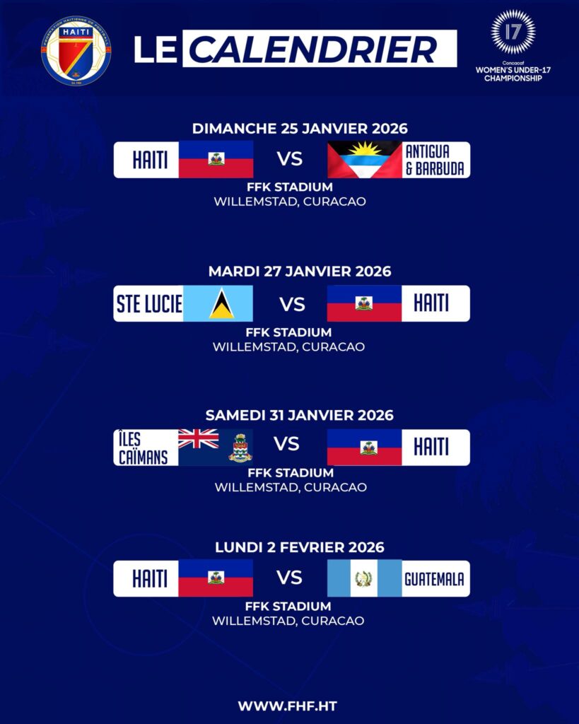 L’heure est venue pour les jeunes Grenadières de lancer leur aventure vers la Coupe du Monde Féminine U17 de la FIFA 2026, qui se tiendra au Qatar. Première étape : Curaçao, où les filles d’Haïti disputeront la phase initiale des éliminatoires de la zone CONCACAF.
